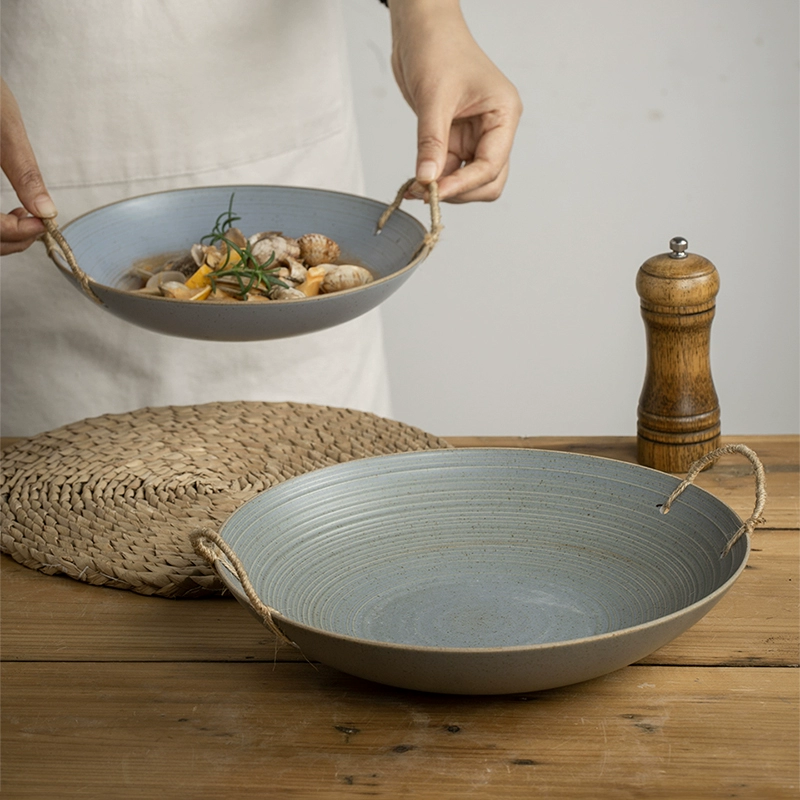 {Heavy Welfare~ Hemp Rope Double Ear Plate} High-grade matte stoneware deep plate Japanese-style rattan clay wood-fired vegetable plate
