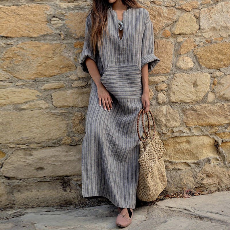 Cross-border hot style European and American new cotton and linen yarn-dyed striped loose long dress