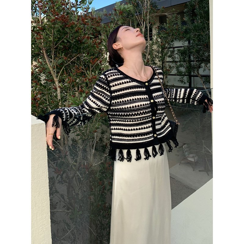 Aisili 2023 spring new long-sleeved striped top small shirt Korean casual tassel knitted sweater female 8210