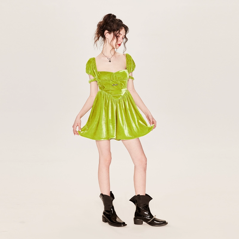 Square neck velvet short sleeve dress