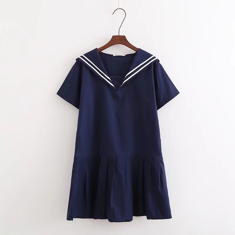 Summer new cotton navy style pleated skirt loose and thin solid color short-sleeved dress C4250