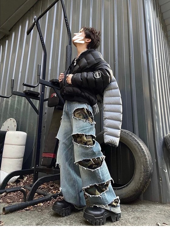 Vintage knife cut hole camouflage patchwork wide leg jeans