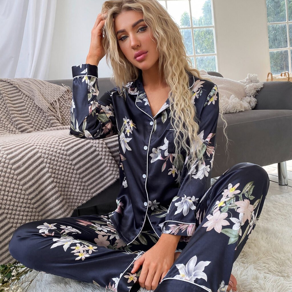 Cross-border foreign trade spring and autumn thin simulation silk striped home clothes lapel cardigan large size outer single ladies suit