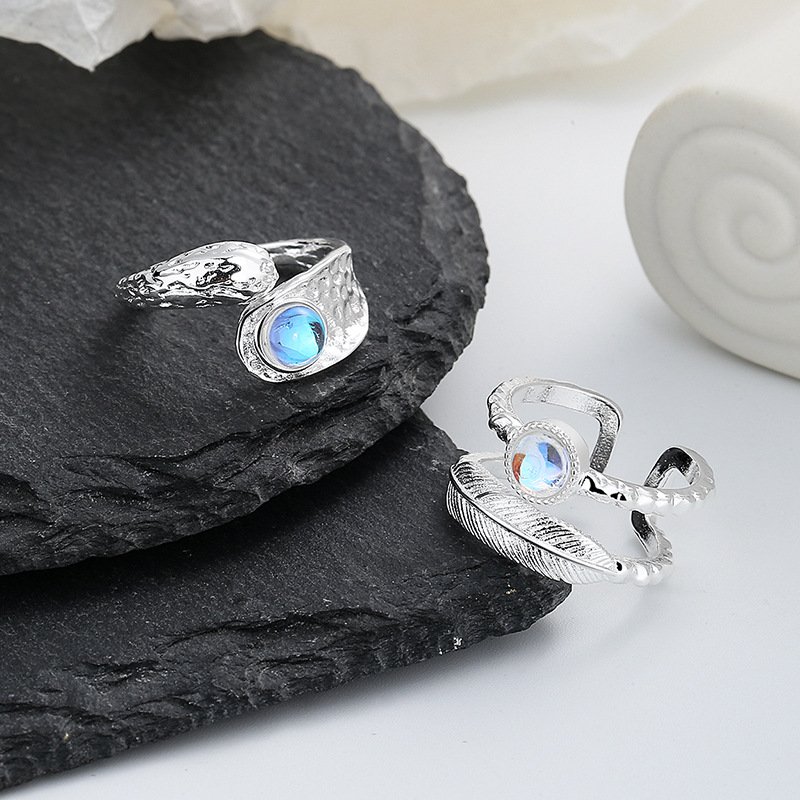 Double-layer opening feather irregular moonstone French ins cold wind minority original design female index finger ring