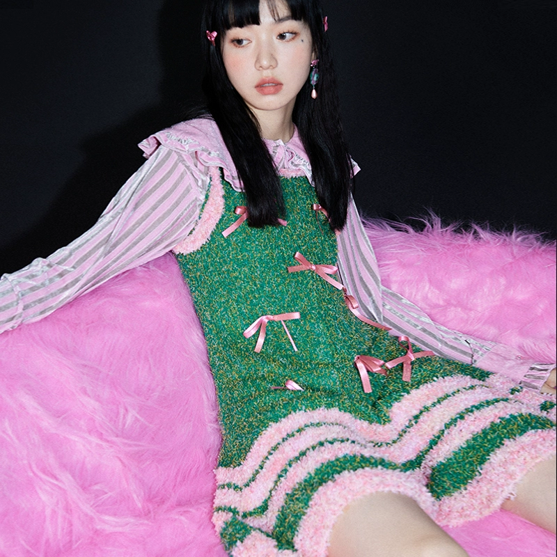 Hollow stripe bow vest dress