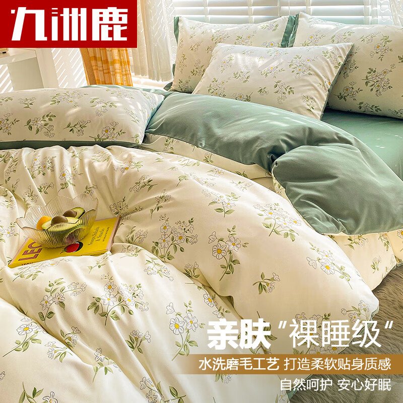 Jiuzhou deer bed four-piece bedding set quilt cover bedding sheet quilt cover four-piece skin-friendly sanding naked sleeping home textile dormitory summer spring and autumn small floral 200*230cm