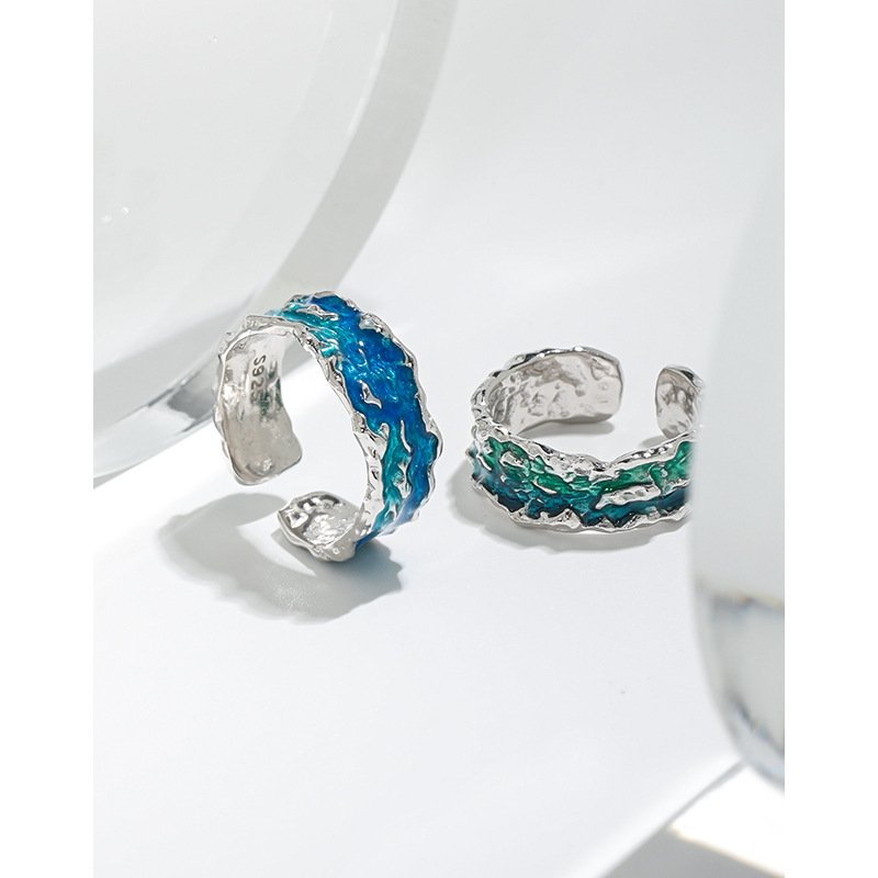 1809 niche design sense irregular texture texture light luxury blue green drip glaze S925 sterling silver ring ring female
