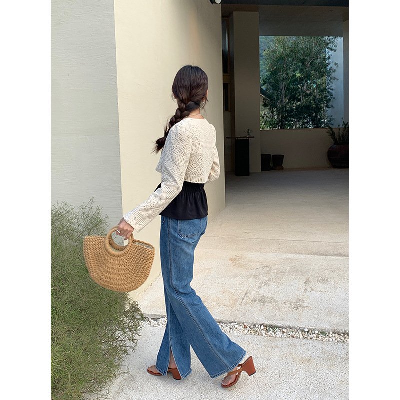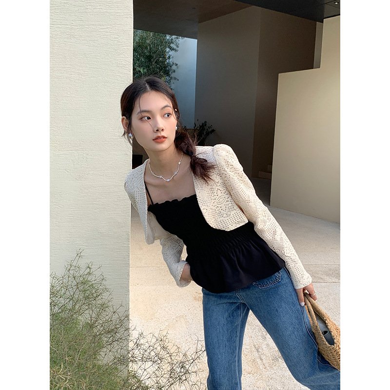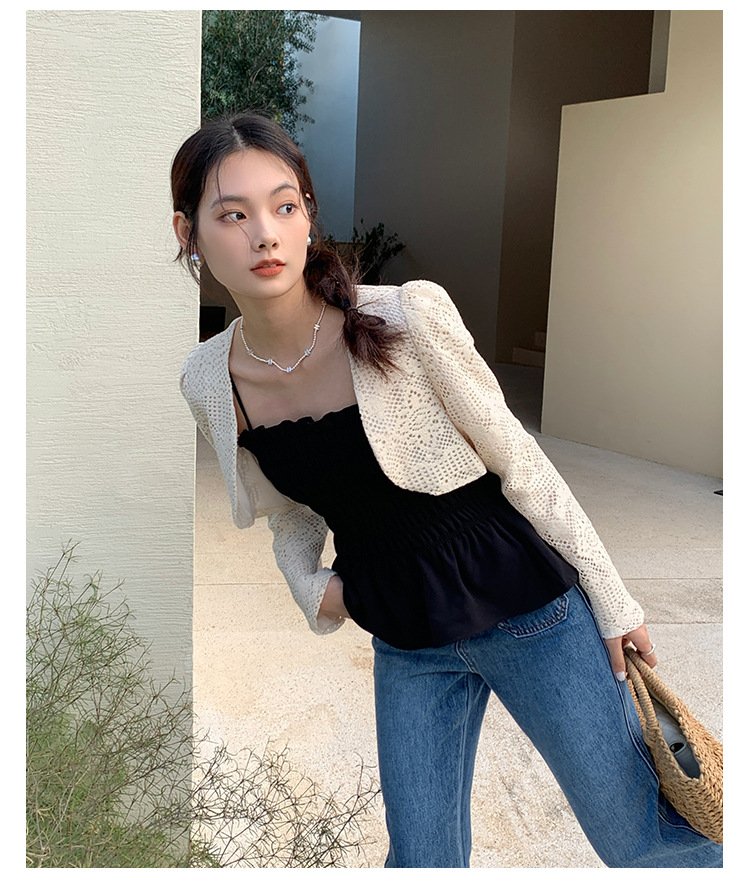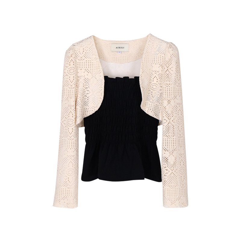 Aixili 2023 spring new lace long-sleeved shawl with small straps and ruffles two-piece suit female 8111
