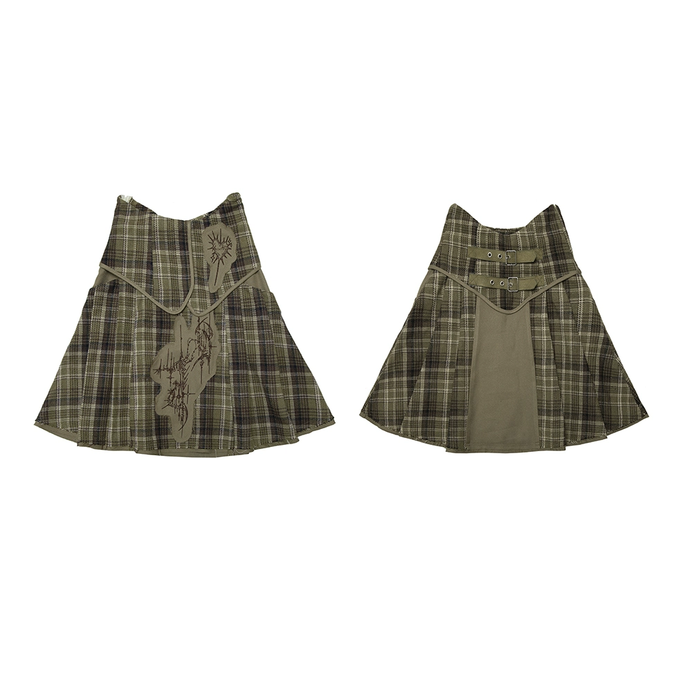 CHECK EMBROIDERY HIGH WAIST PLEATED SKIRT