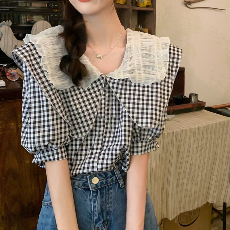 Chic French puff sleeve short-sleeved shirt female all-match summer small plaid design doll collar shirt
