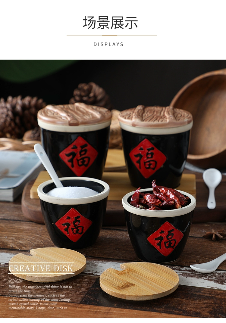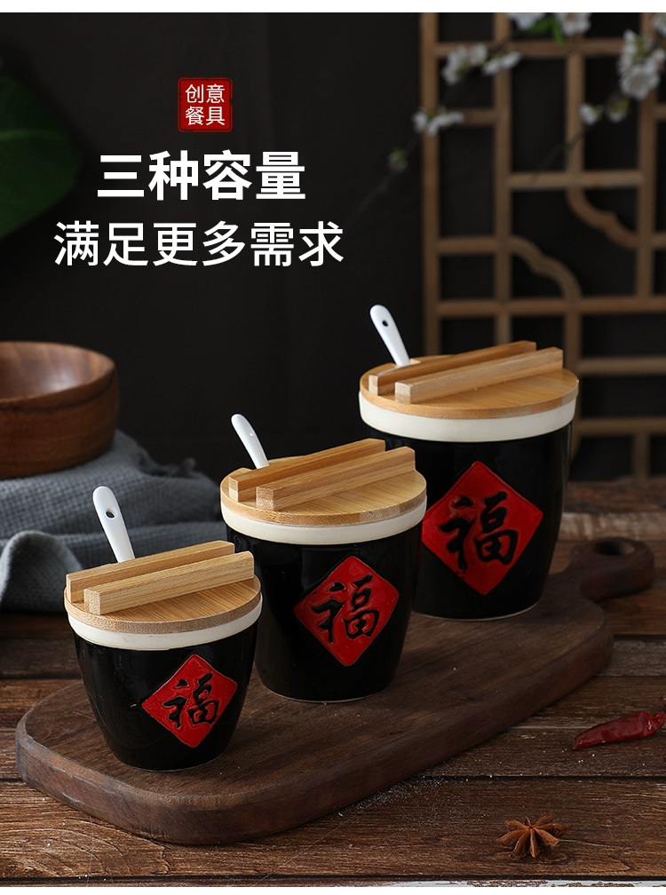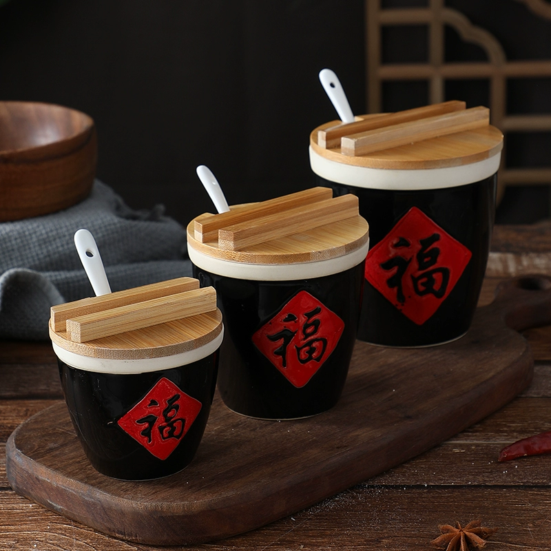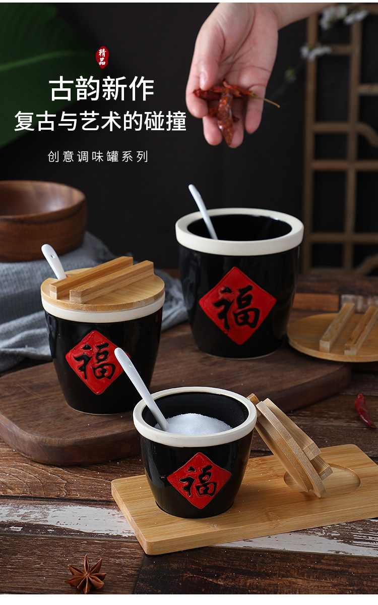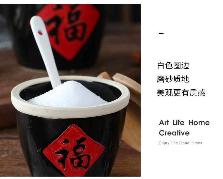 Chinese creative seasoning bottle commercial kitchen ceramic blessing jar with spoon small seasoning box salt chili blessing jar sauce salt jar