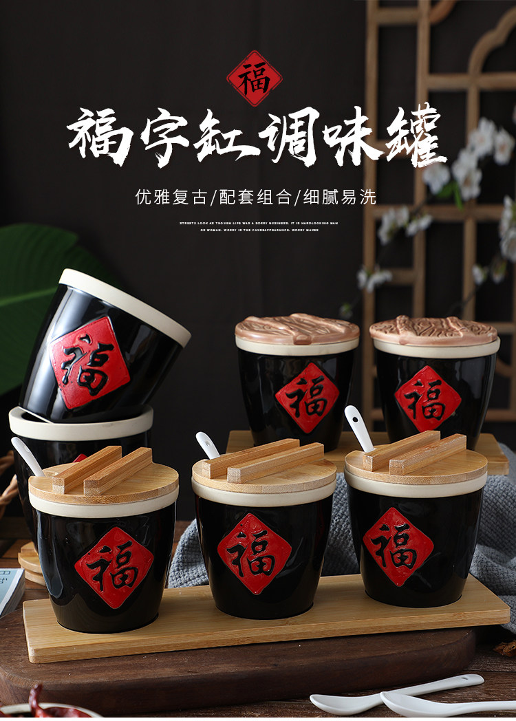 Be the first to review “Chinese creative seasoning bottle commercial kitchen ceramic blessing jar with spoon small seasoning box salt chili blessing jar sauce salt jar”