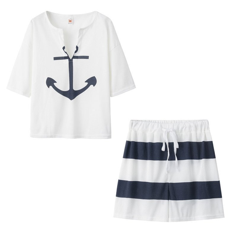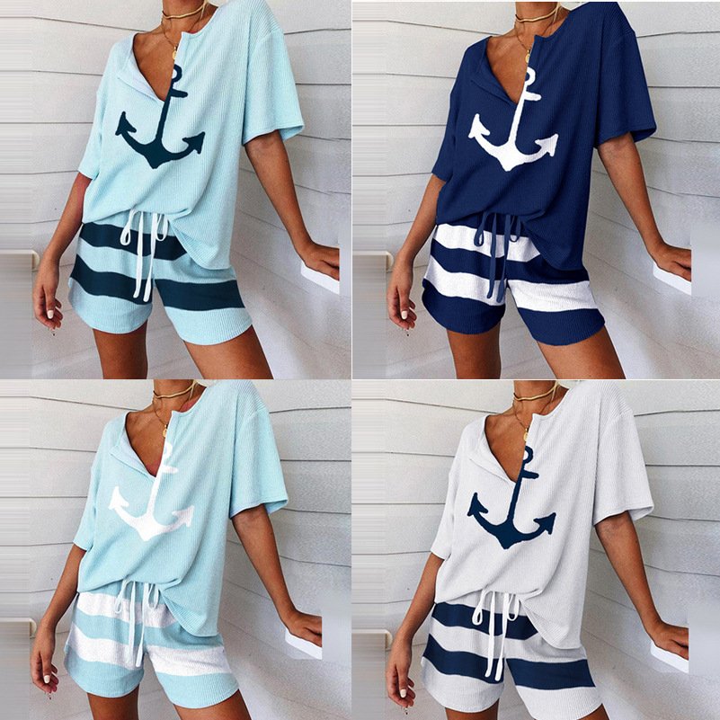 European and American popular V-neck anchor pattern printing short-sleeved tops, wide-leg pants, shorts, loose and thin suits for women