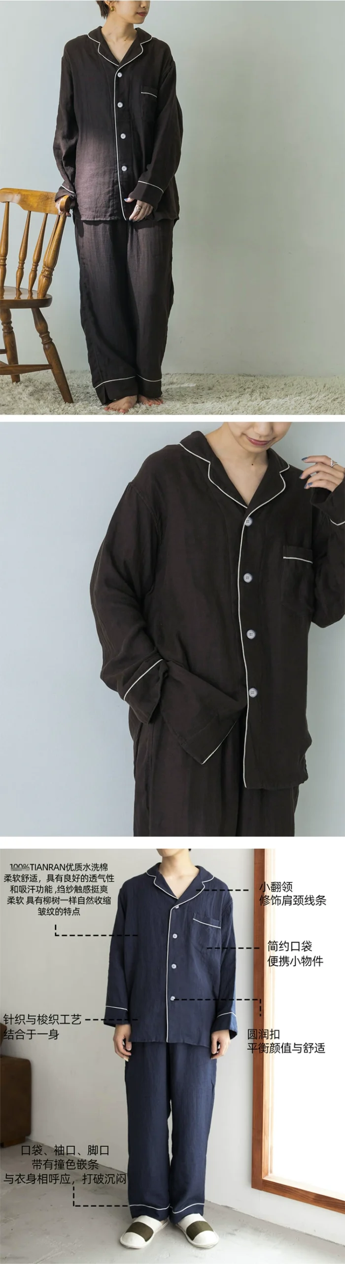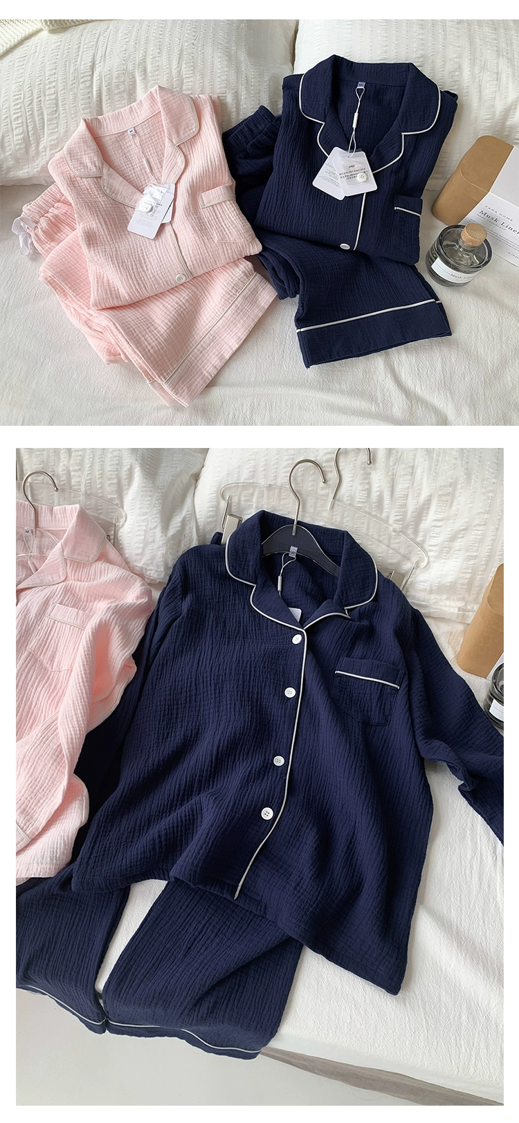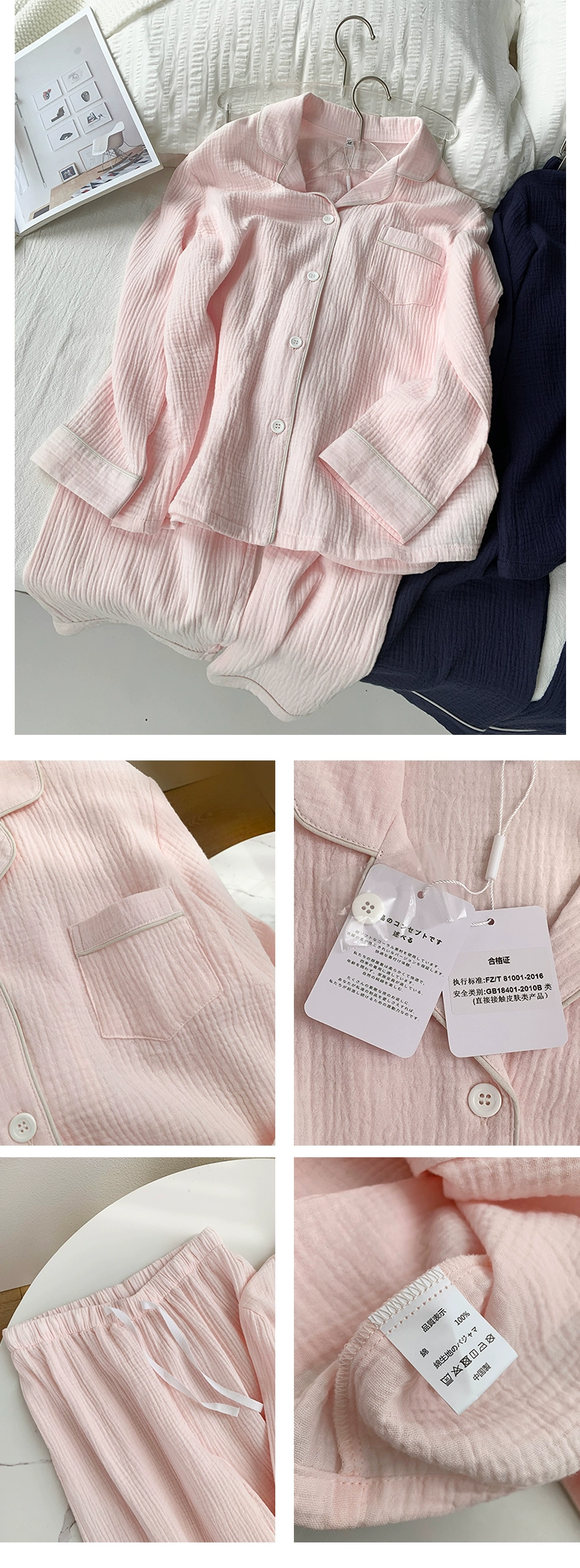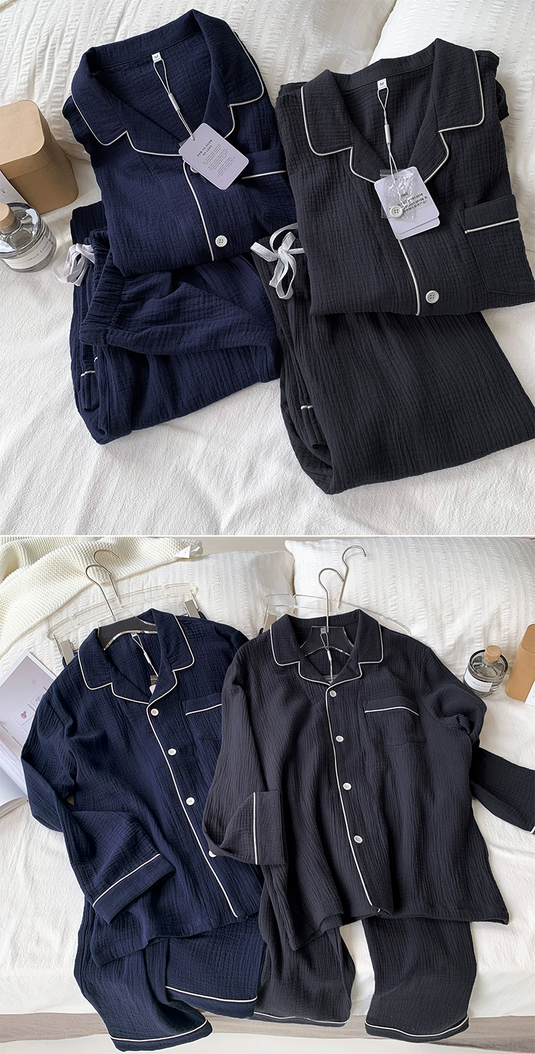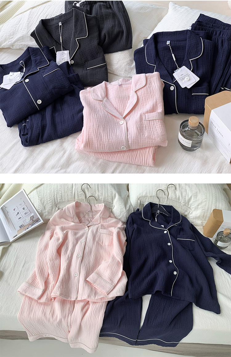 Japanese couple models skin-friendly breathable solid color double-layer cotton yarn long-sleeved trousers men and women pure cotton home clothes pajamas set