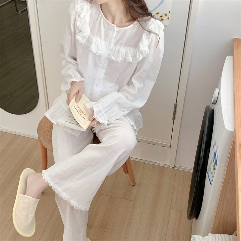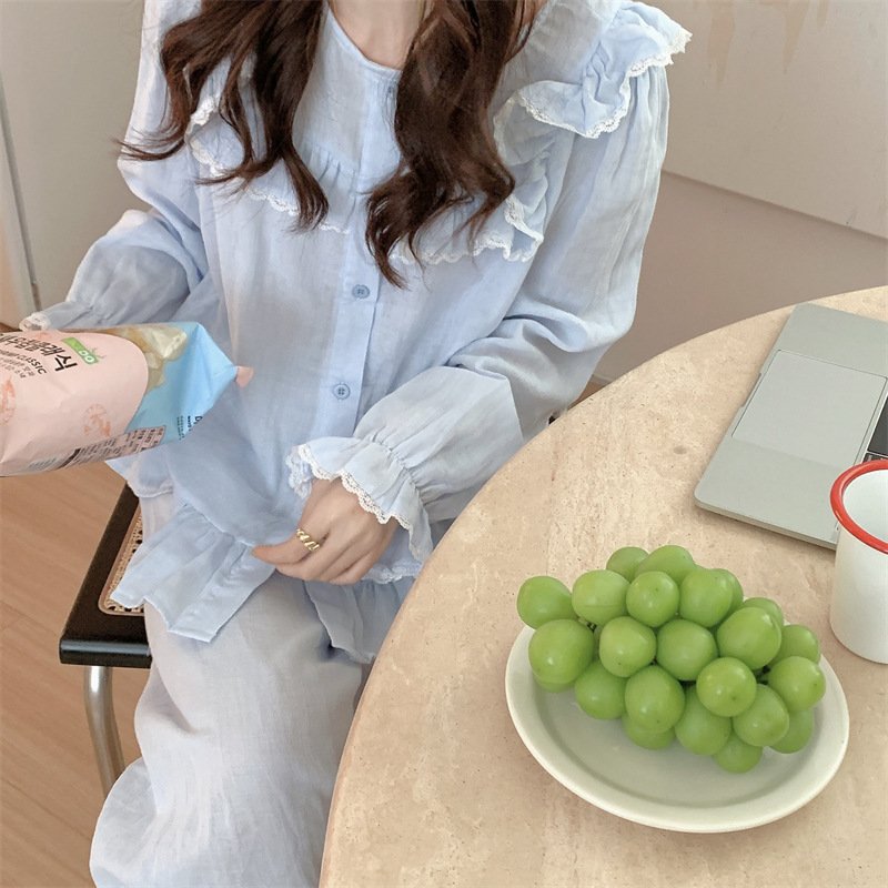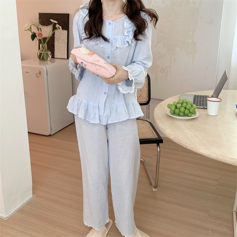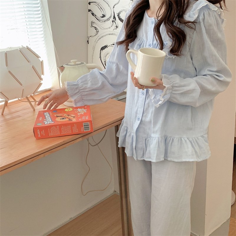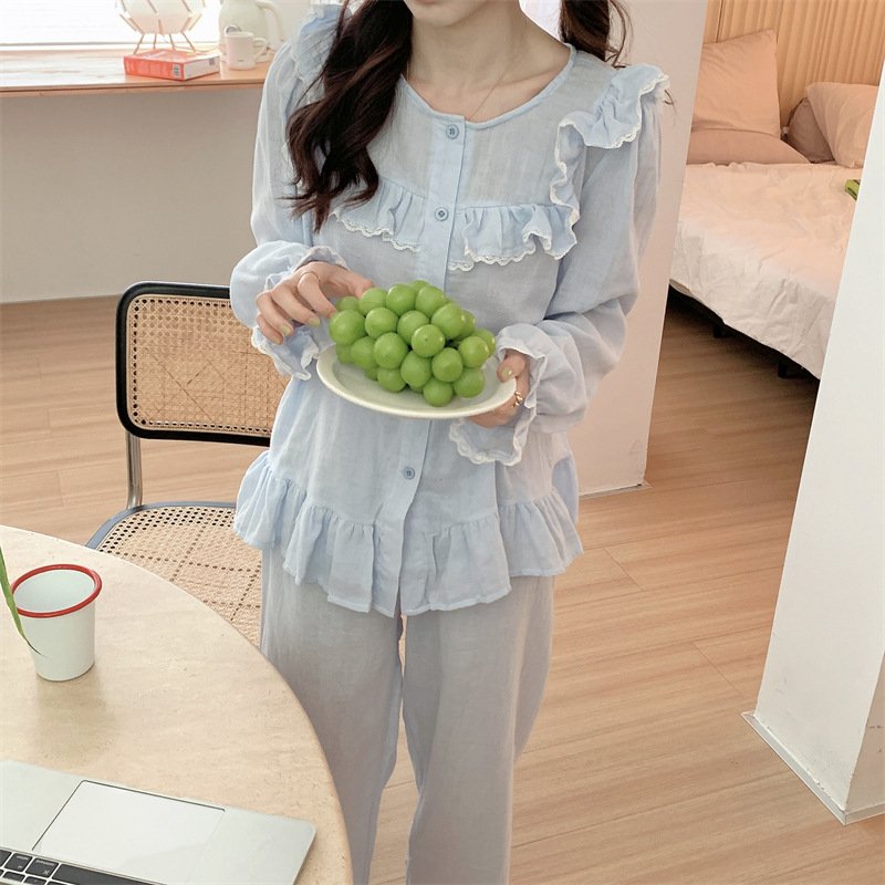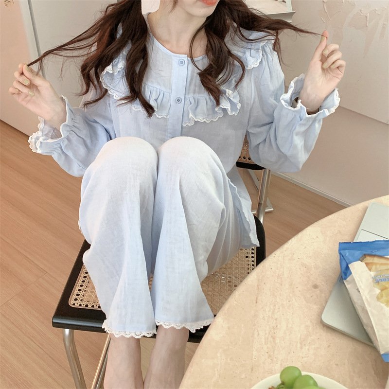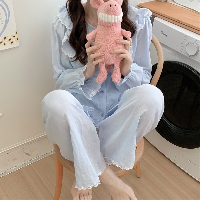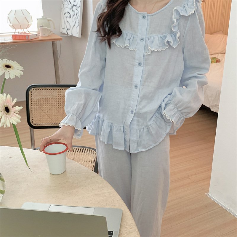Korean foreign trade ladies ins cotton double-layer gauze new French style solid color pajamas long-sleeved round neck home service suit