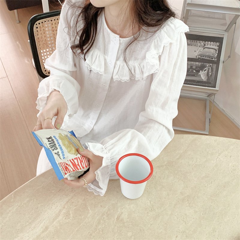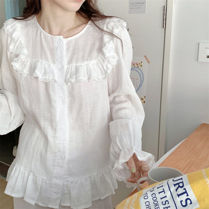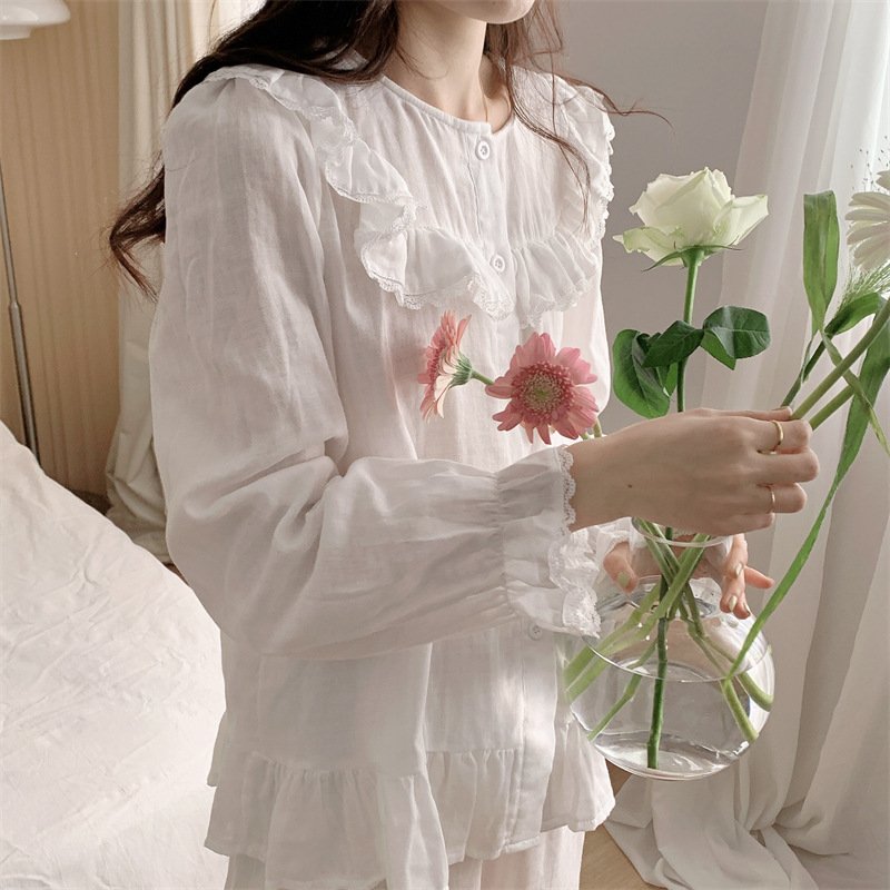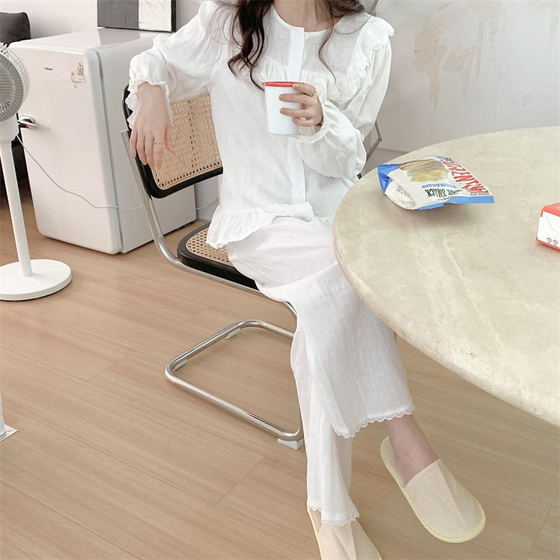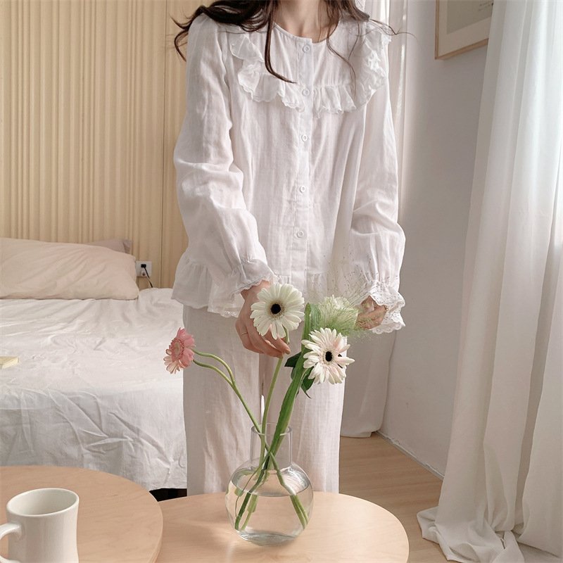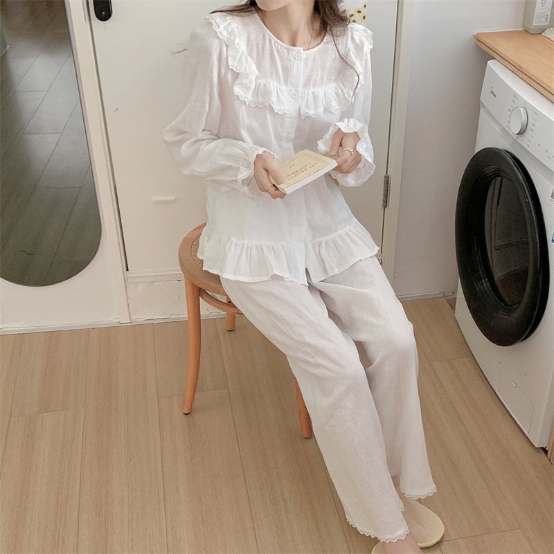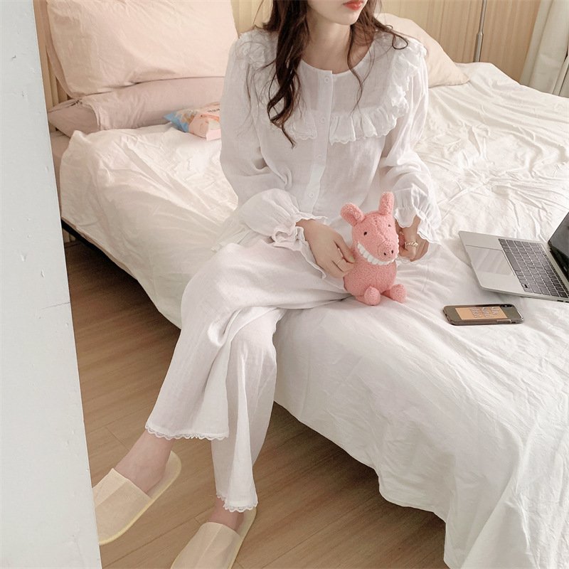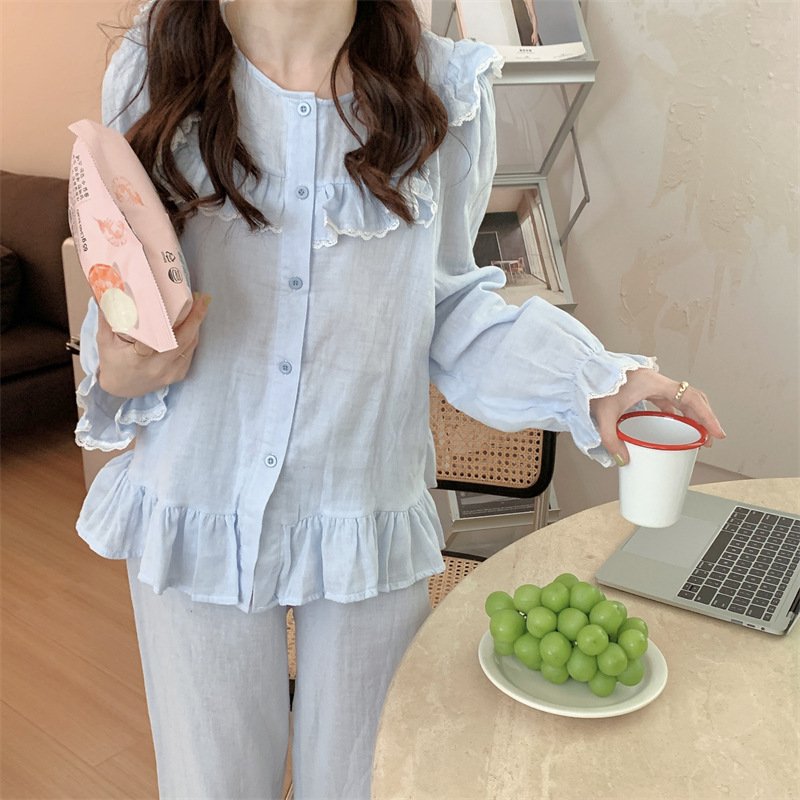 Korean foreign trade ladies ins cotton double-layer gauze new French style solid color pajamas long-sleeved round neck home service suit