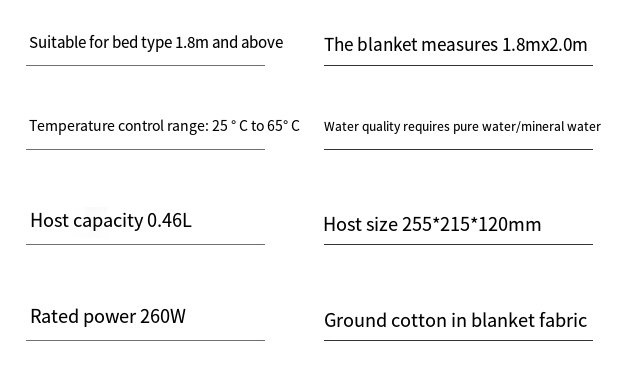 [High-end model-accurate temperature control voice prompt] 200*150cm ,[High-end model-accurate temperature control voice prompt] 200*180cm ,[Standard Model – Knob Temperature Control] 180*150cm ,[Standard Model – Knob Temperature Control] 180*90cm ,[Standard Model – Knob Temperature Control] 200*180cm ,[Upgrade-LCD Remote Control] 180*150cm ,[Upgrade-LCD Remote Control] 180*90cm ,[Upgrade-LCD Remote Control] 200*180cm |