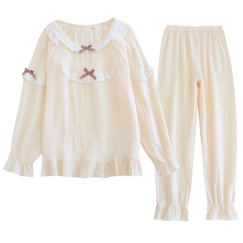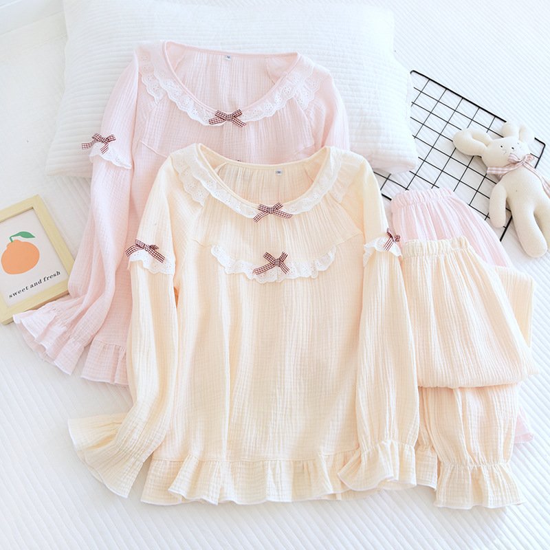 Women’s crepe pullover pajamas spring and summer Japanese thin section long-sleeved washed cotton large size solid color cotton yarn home service