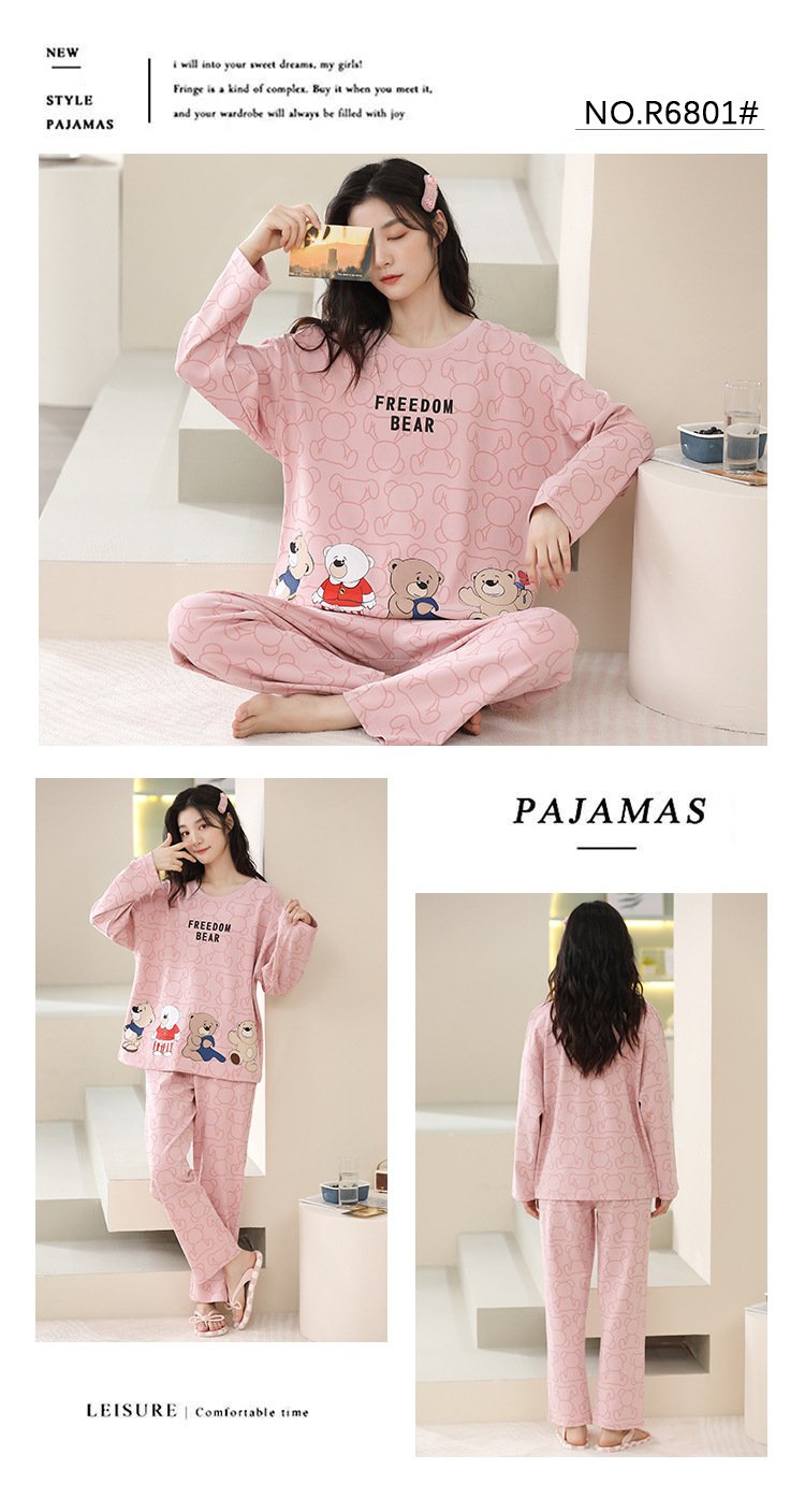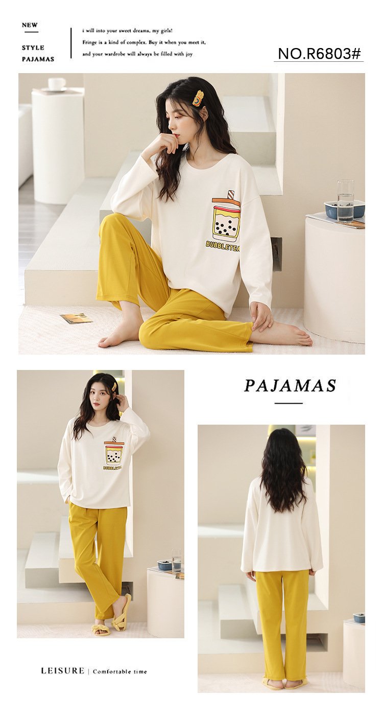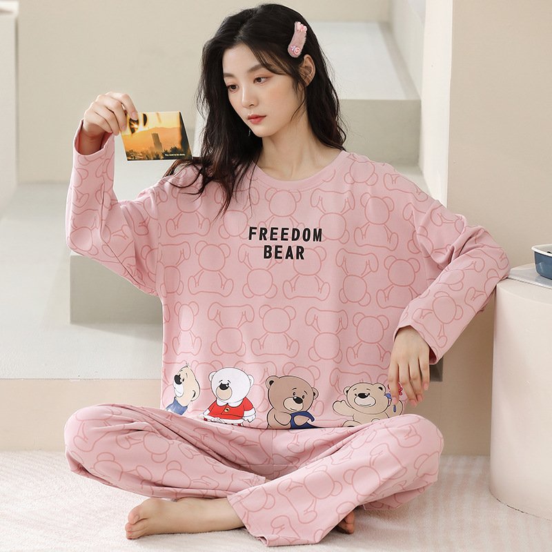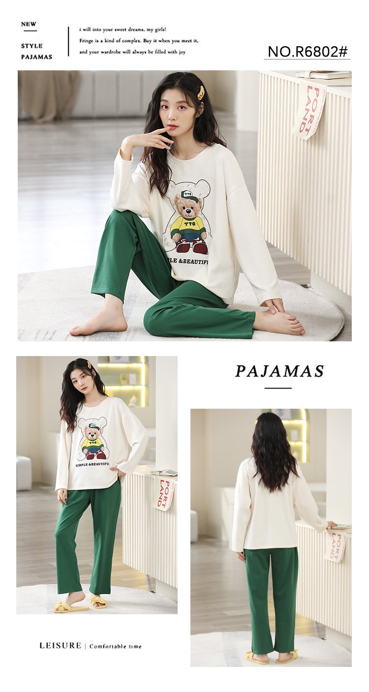 Women’s pajamas spring and autumn cotton long-sleeved trousers round neck new simple and sweet Korean version can be worn outside home service suit