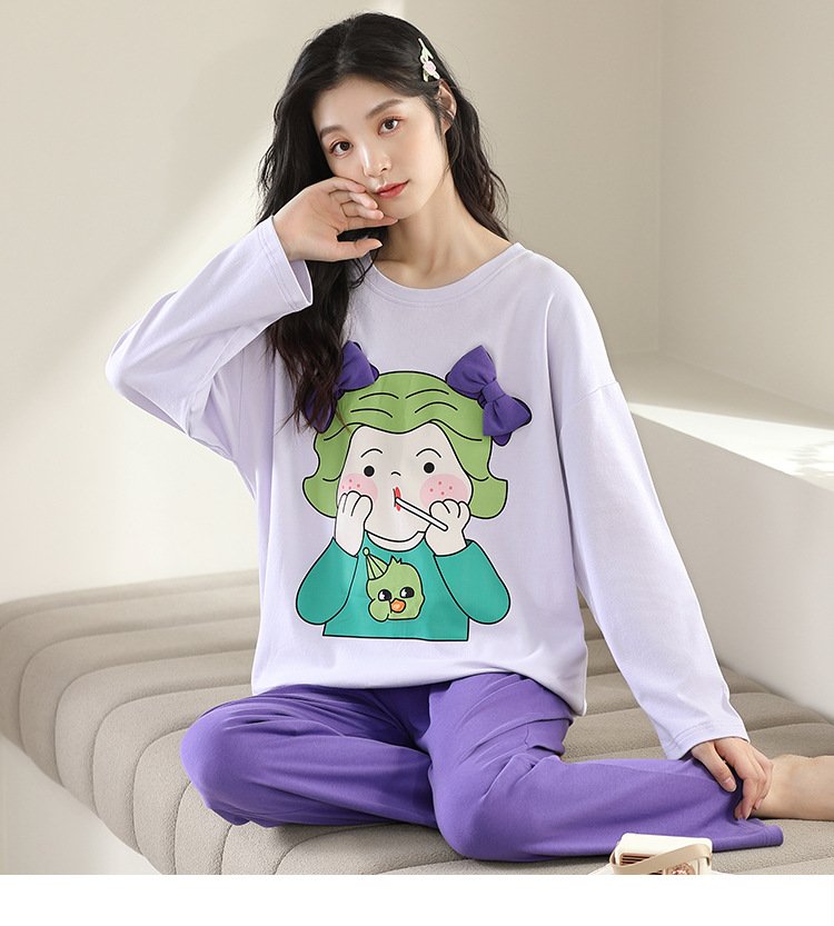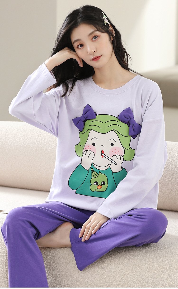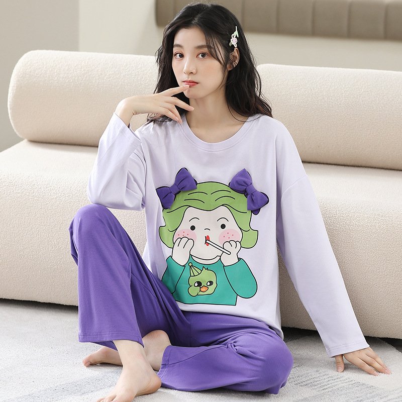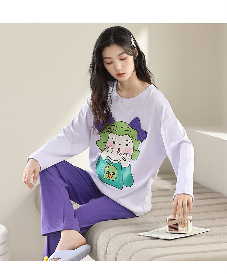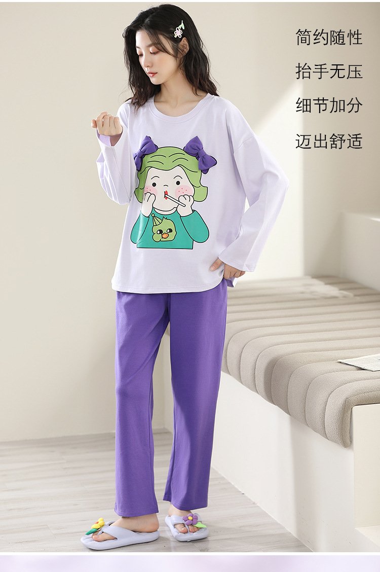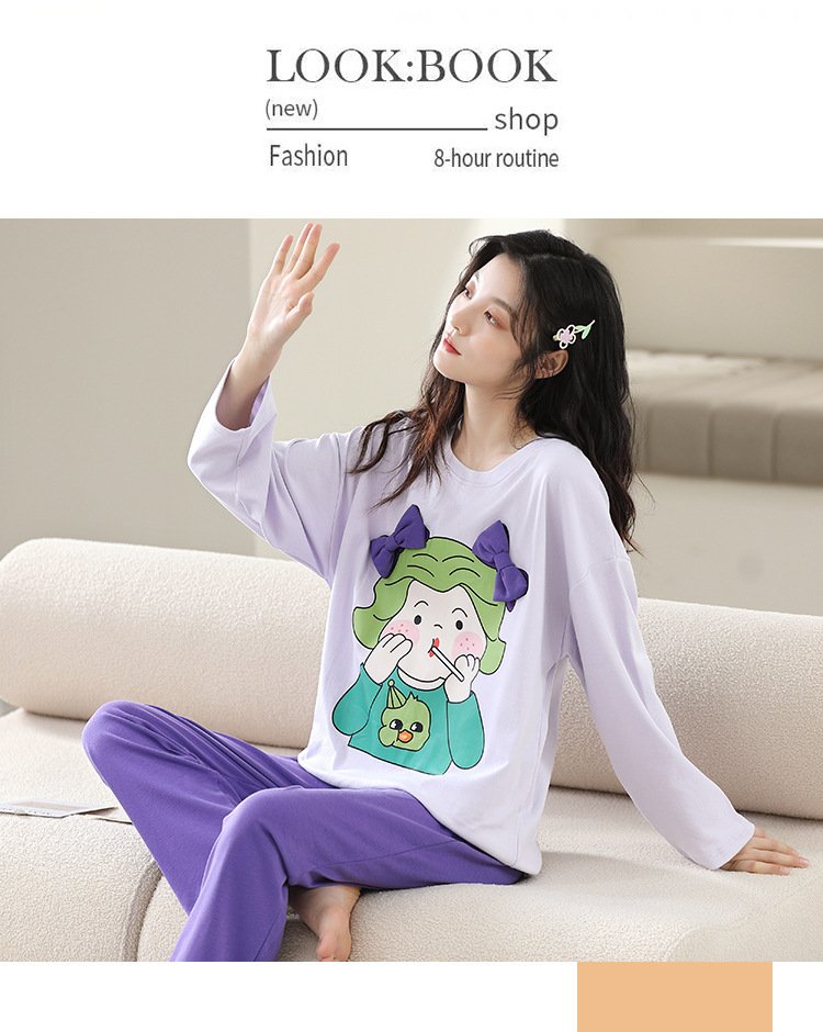 Women’s pajamas spring and autumn cotton long-sleeved trousers round neck new simple and sweet Korean version can be worn outside home service suit